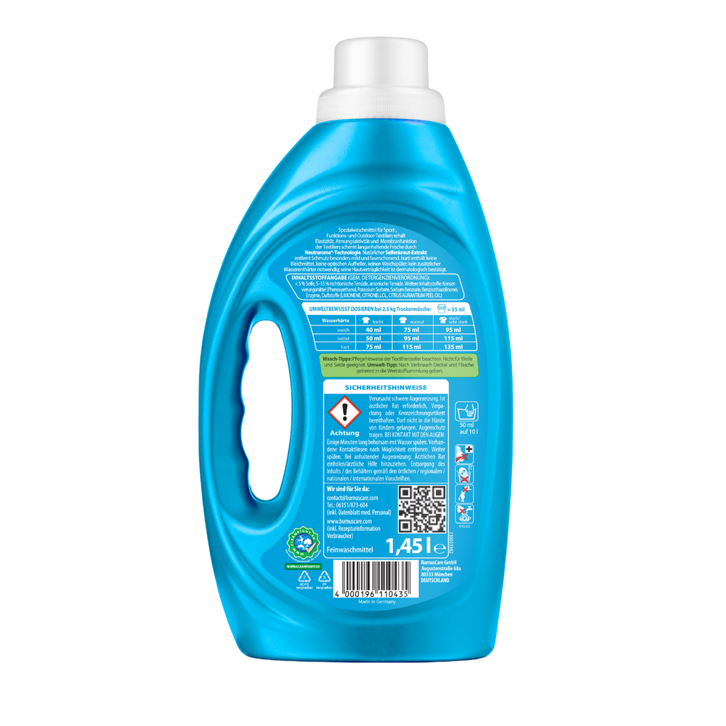 Ideal für Sport- und Outdoor-Textilien: burti reinigt schonend, schützt atmungsaktive Membranen und sorgt dank Frische-Faktor für langanhaltende Hygiene. Perfekt für 29 Waschladungen – leistungsstark und faserschonend.