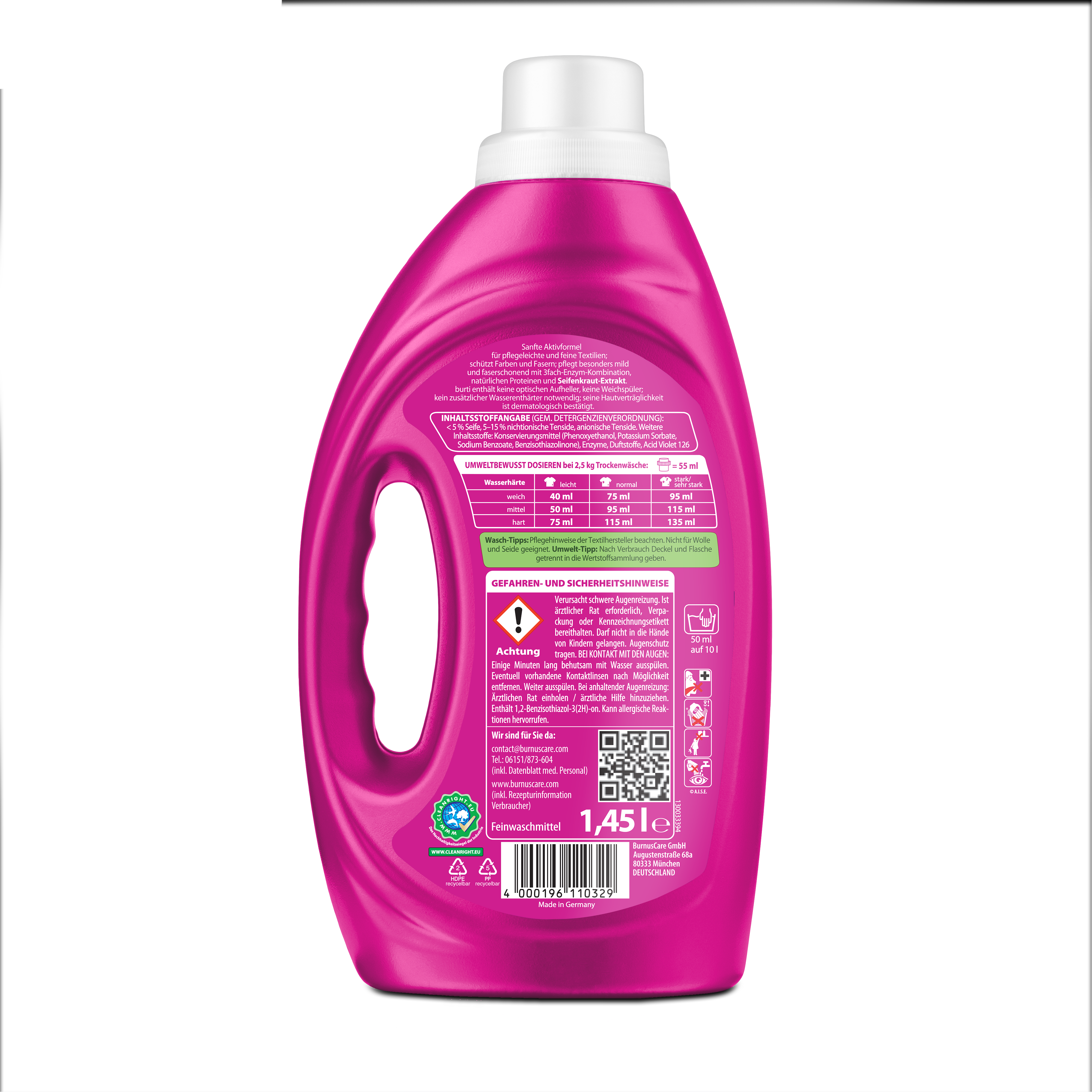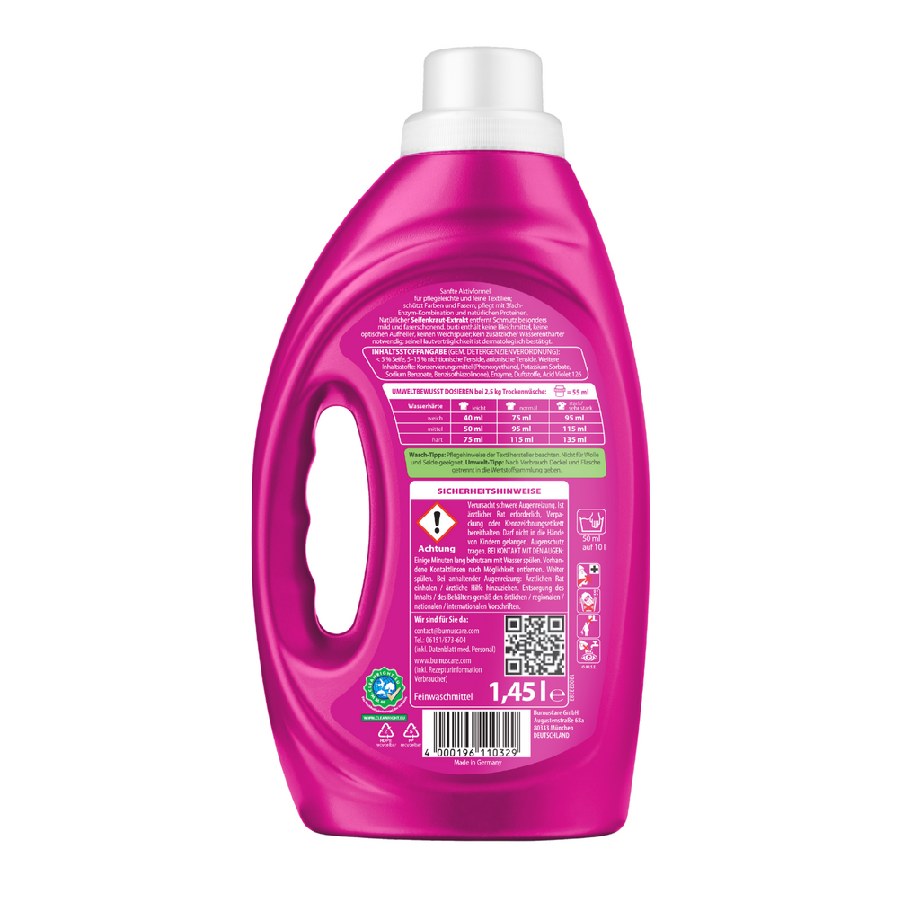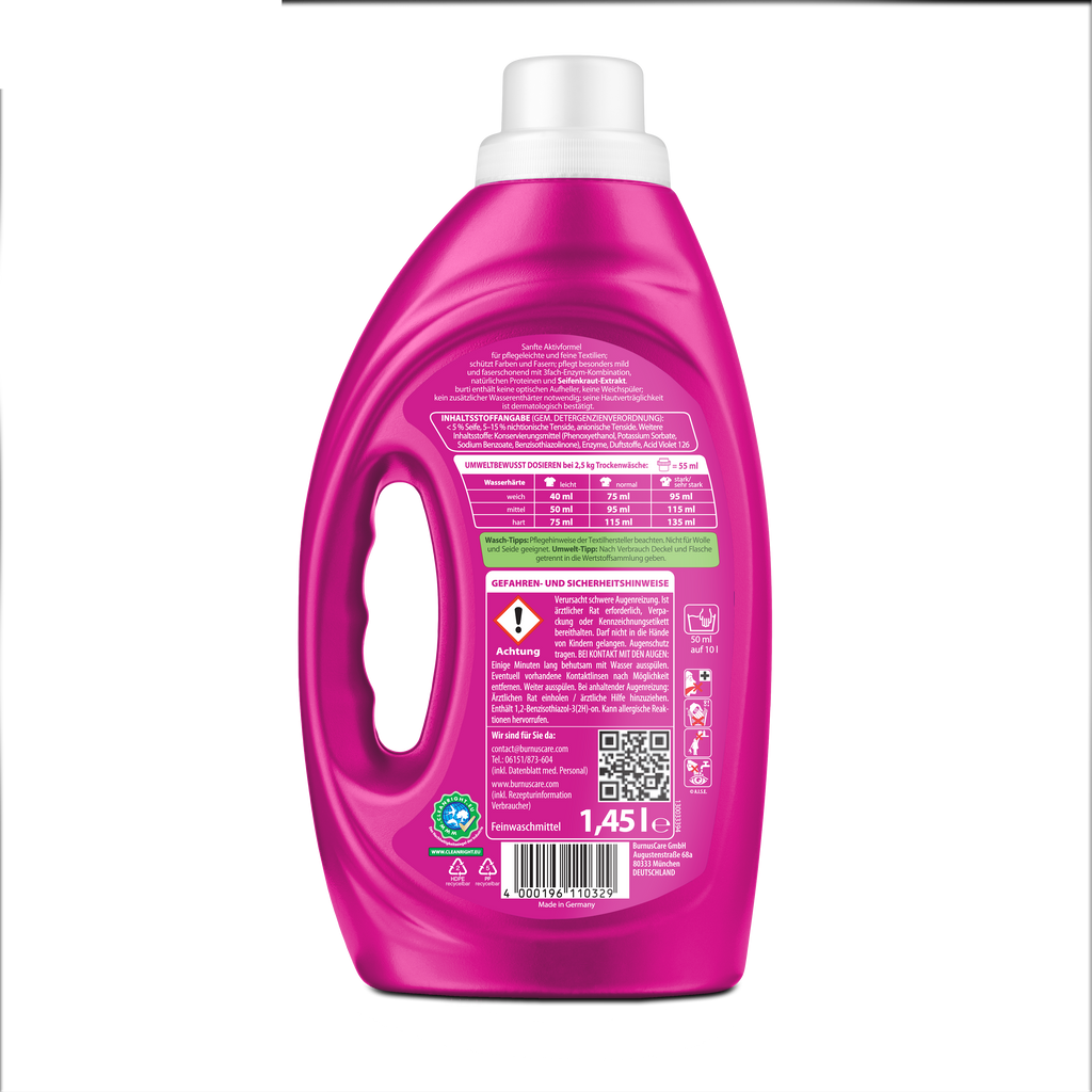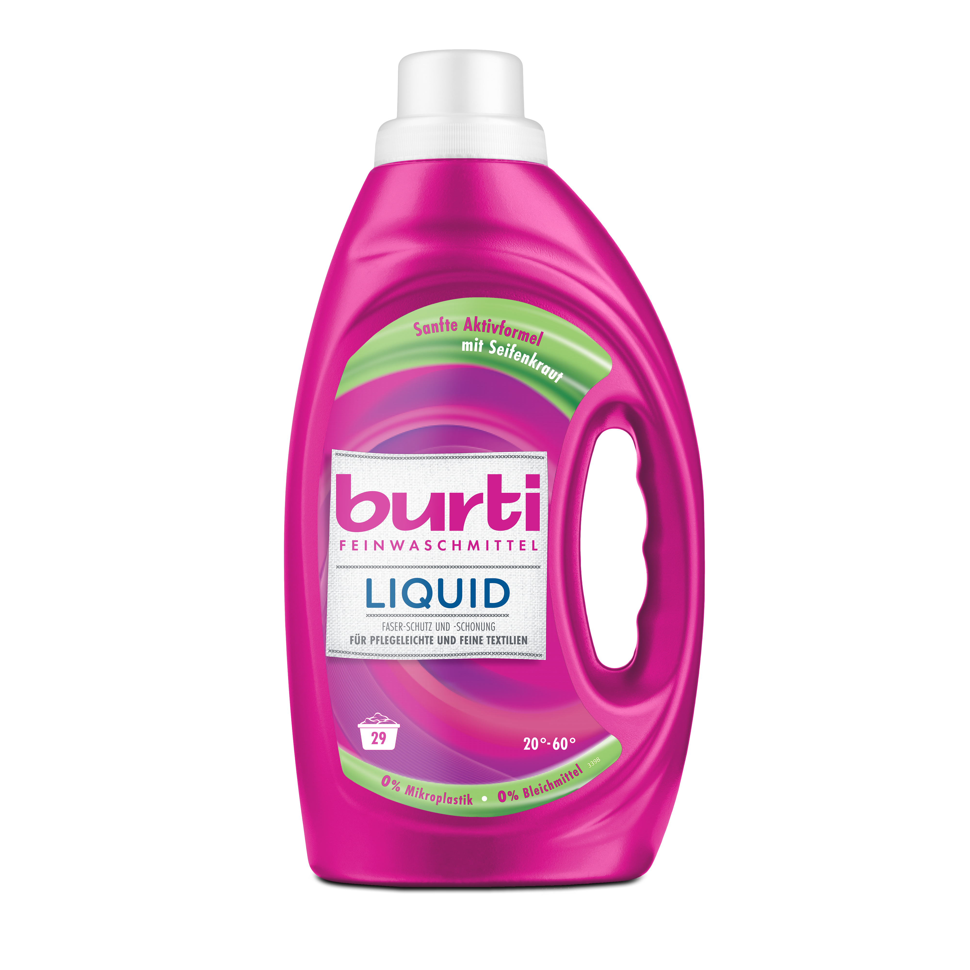 Burti LIQUID, with its triple enzyme combination, gently cleans easy-care and delicate fabrics. The special care booster protects the fibers and colors. Burti Liquid not only protects your laundry, but also the environment, as the optimized formula allows for a lower detergent dosage. Laundry is gently cleaned and cared for simultaneously.