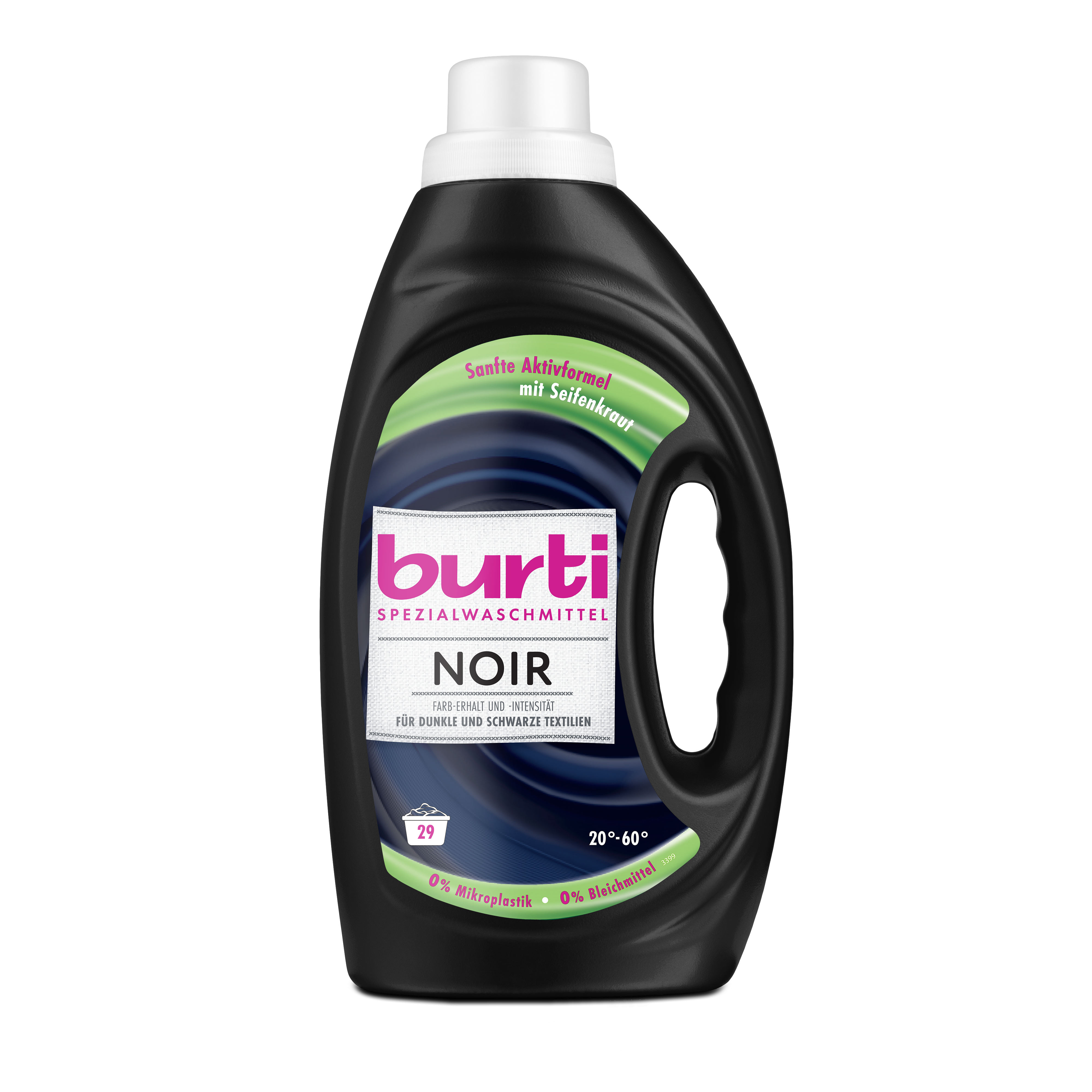 Burti NOIR, with its quadruple enzyme combination and Black Control System, cleans black and dark textiles particularly gently. The special care booster protects the fibers and protects the colors. Burti Noir is free of bleach and optical brighteners.