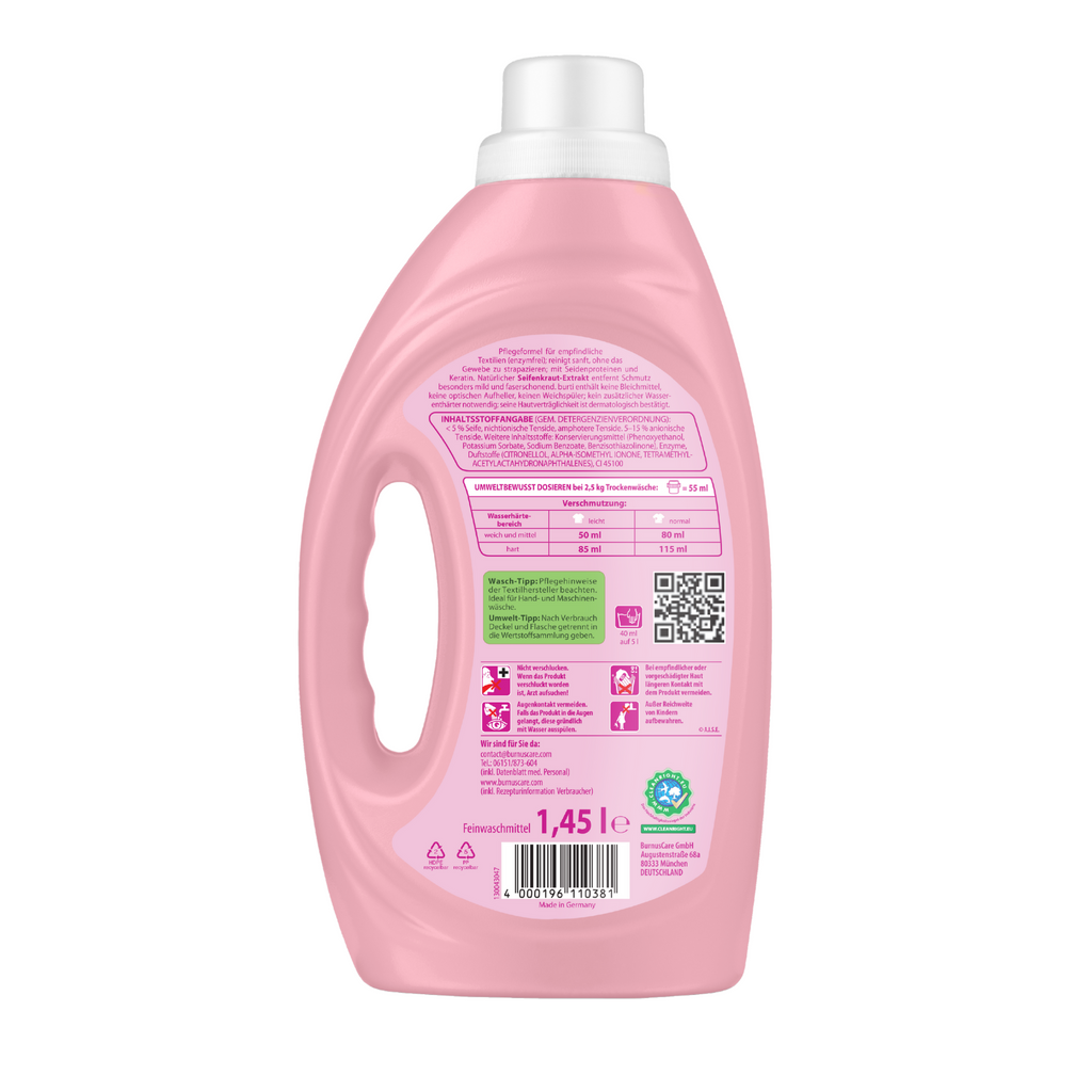 Burti WOOL & SILK with keratin and silk proteins provides a particularly gentle cleanse for delicate textiles and is gentle on wool, silk, and down. The proven active formula has been optimized for cleaning power, is enzyme-free, and has been supplemented with a plant-based care booster.